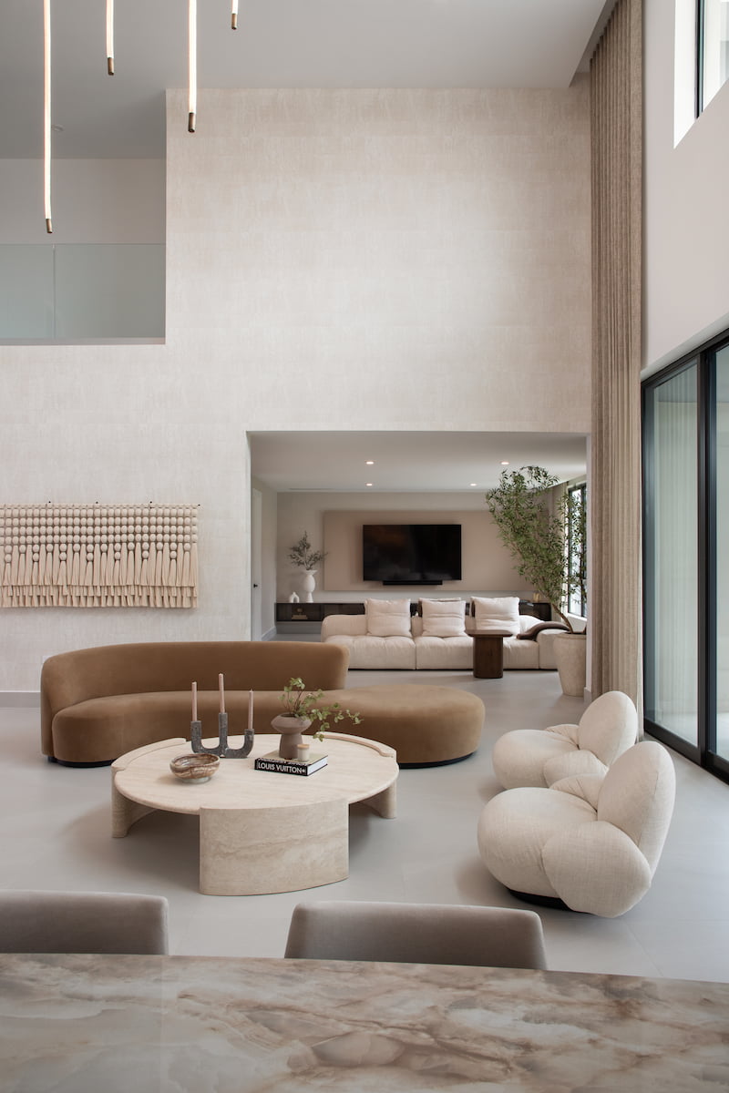 "La vivienda tiene líneas rectas, por lo que interiorizamos con elementos que aportan fluidez: elegimos muebles curvos, arcos y detalles orgánicos que suavizan la geometría y crean armonía.” – Di. Cecilia Refojos