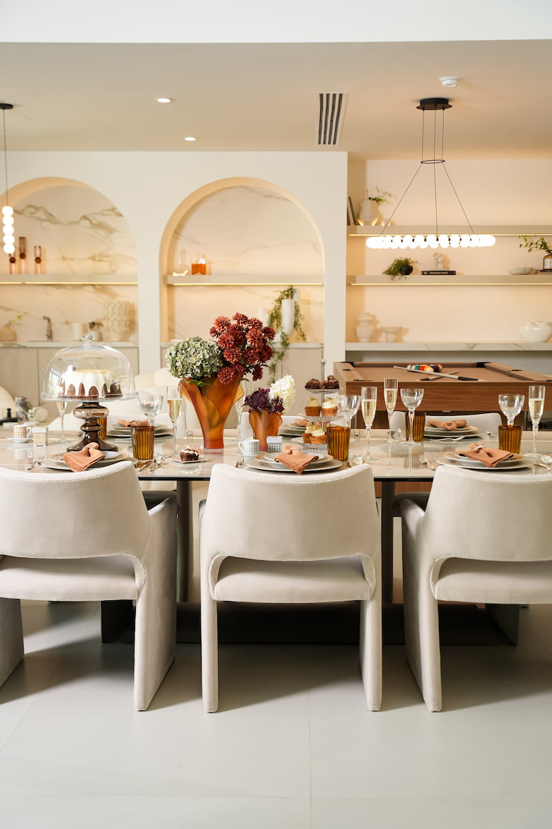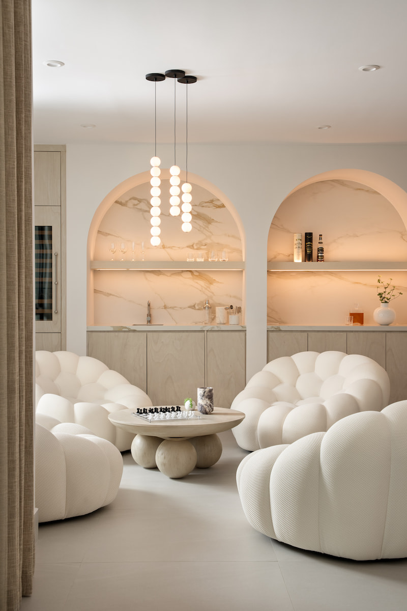 Al otro extremo de la sala se encuentra el salón de entretenimiento, un espacio divertido con cuatro cómodas butacas Bubble y un mueble que integra vinera, barra y billar. El mueble de pared, diseñado a medida, sirve de fondo al salón. Cecilia diseñó dos arcos revestidos en Lamitech con iluminación integrada que, al caer el sol, brindan una sensación de calidez. A un lado de la unidad, cuatro taburetes permiten sentar personas adicionales si es necesario, nuevamente uniendo forma y función.