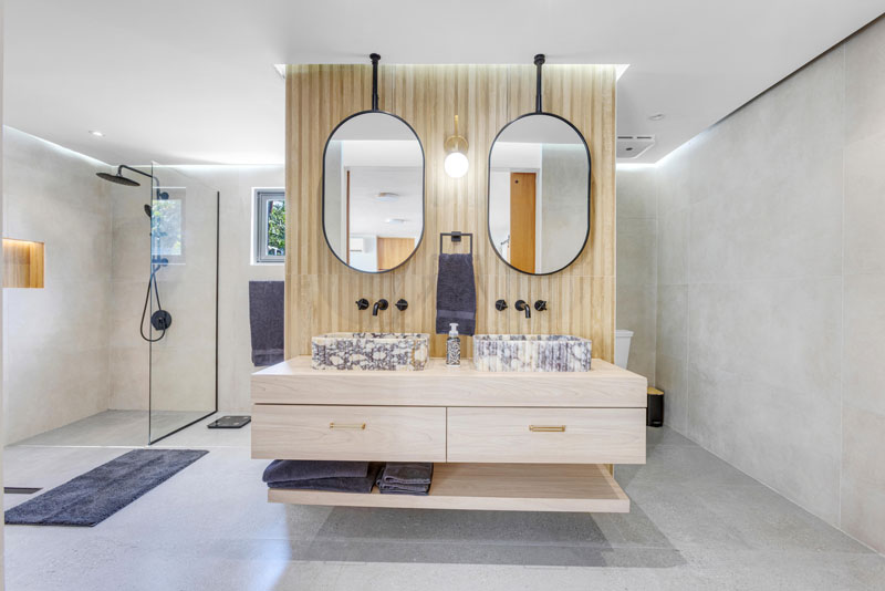 El interior revela un trabajo meticuloso: baño principal en mármol Calacatta Viola con acabado fluted y herrajes negro mate; baños secundarios con texturas de concreto y piedra que equilibran modernidad y calidez. En el exterior, la piscina a sfioro, integrada a la terraza y con acceso directo desde la habitación principal, la sala y la cocina, transforma la residencia en un escenario natural para el disfrute, el entretenimiento y la contemplación privada.