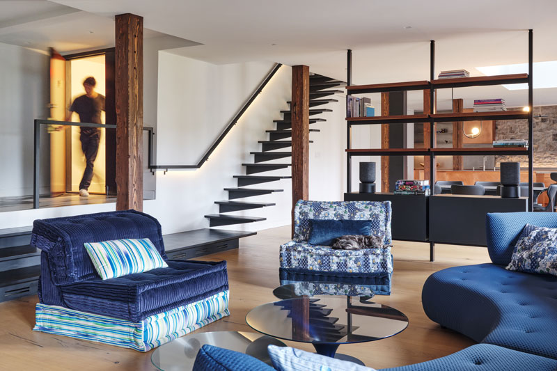 La escalera que conecta ambos niveles es otra joya del proyecto: una pieza escultórica que funciona también como banco y mueble. Más que un elemento de circulación, es arquitectura habitable. Conduce al ático, ahora reservado a los dormitorios, donde la atmósfera se vuelve más íntima sin perder carácter.