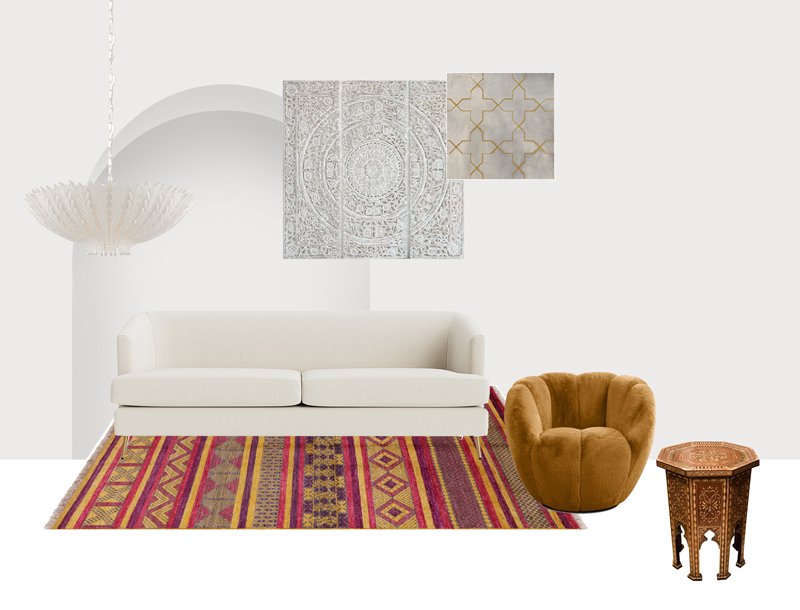 • Coloca un sofá en tela de color sólido y de poca altura sobre alfombra marroquí de colores típicos del estilo.