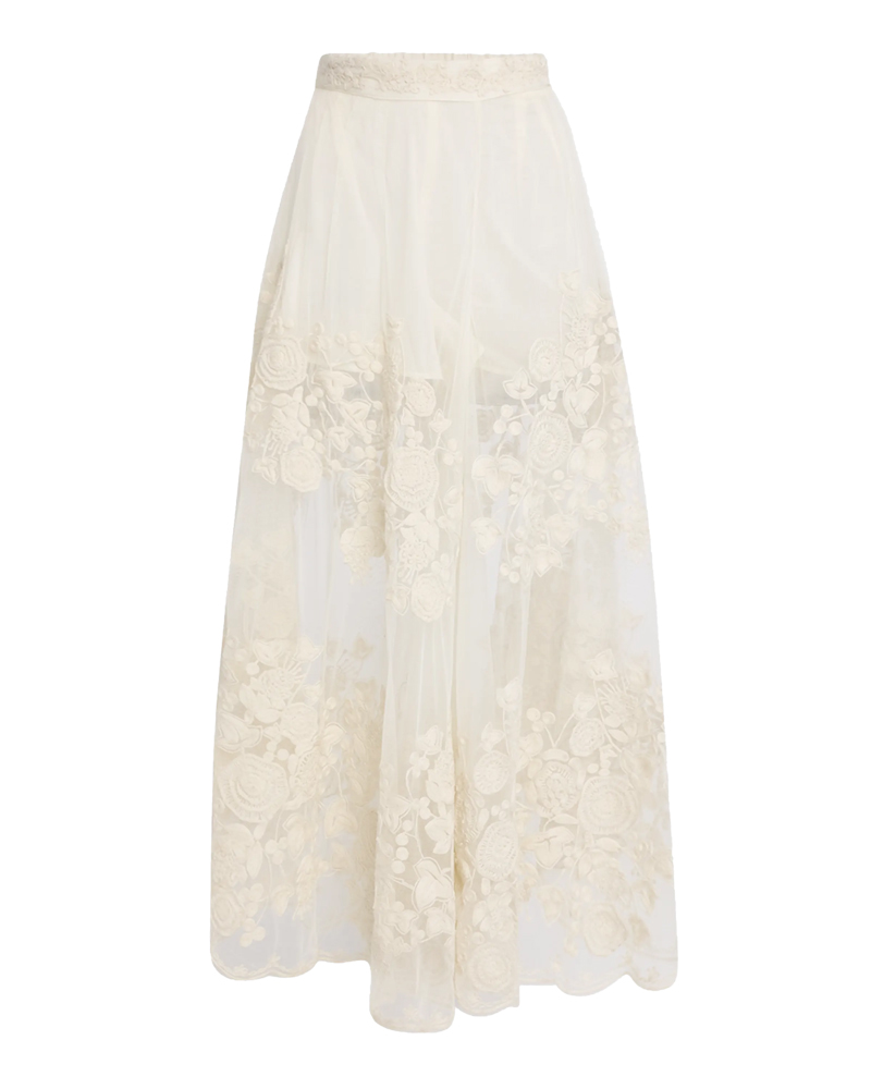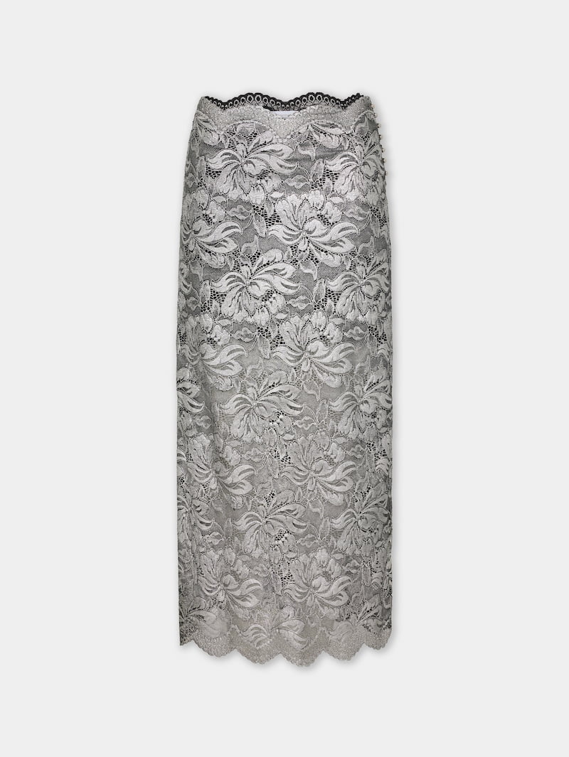 Falda midi en encaje plateado. De noche: perfecta con sandalias minimalistas o un top satinado para un look sofisticado y vanguardista.