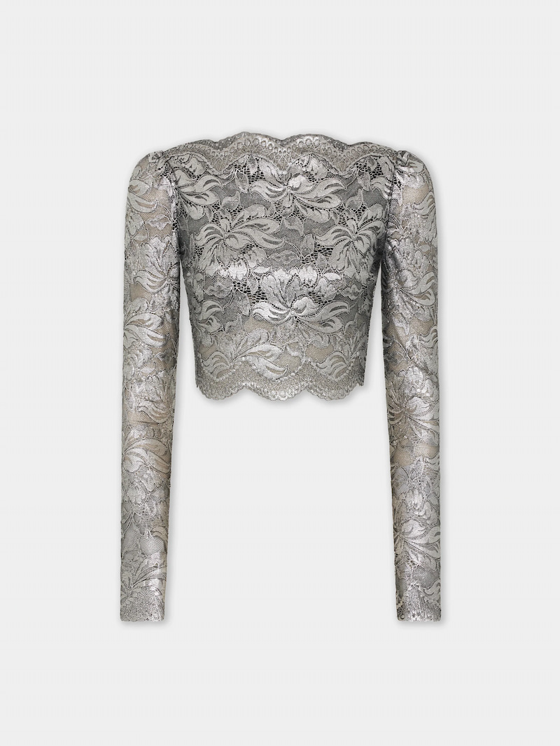 Cropped Top en encaje con foil plateado. Con denim: combínalo con jeans rectos o acampanados para un contraste moderno que equilibra lo femenino con lo urbano.