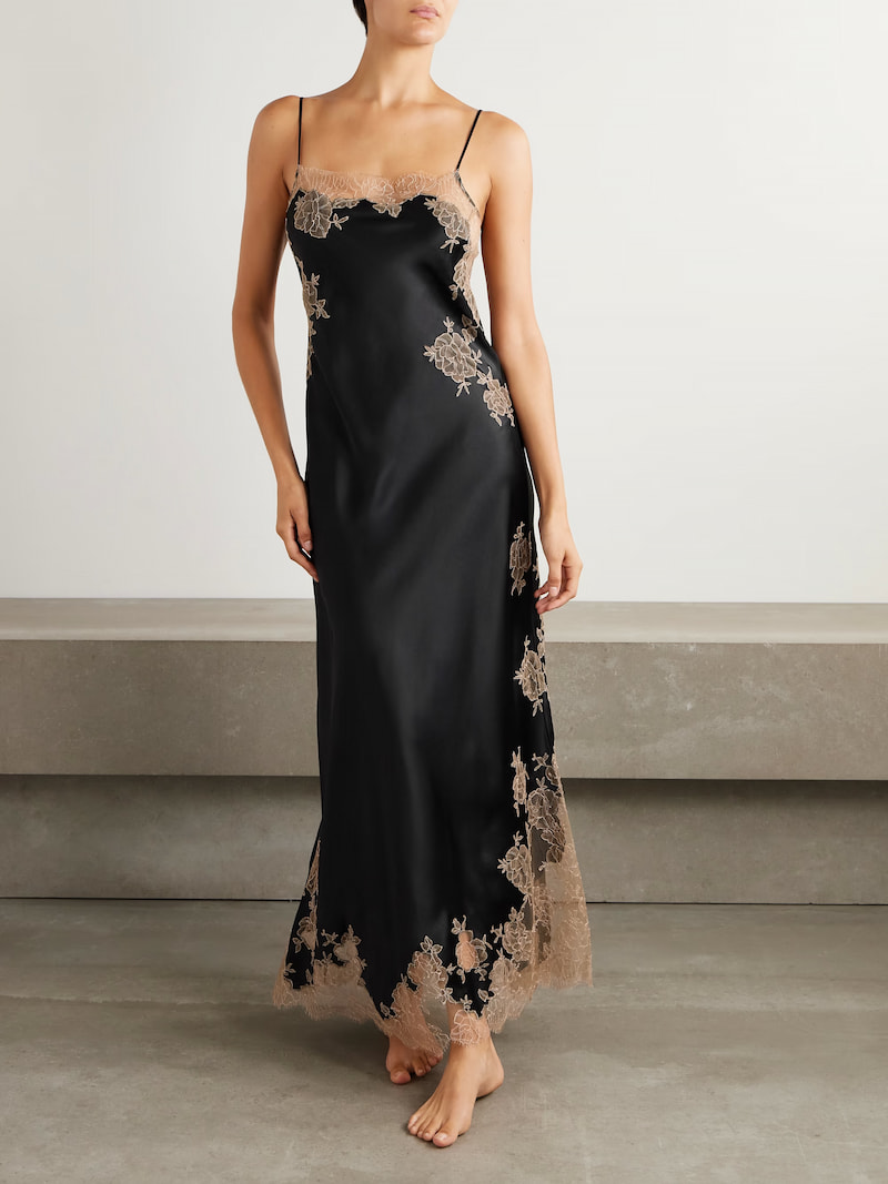 Vestido lencero de seda con encaje. De noche: la versión más etérea de la tendencia, úsalo solo con tacones finos o bajo un blazer oversize para un contraste inesperado.