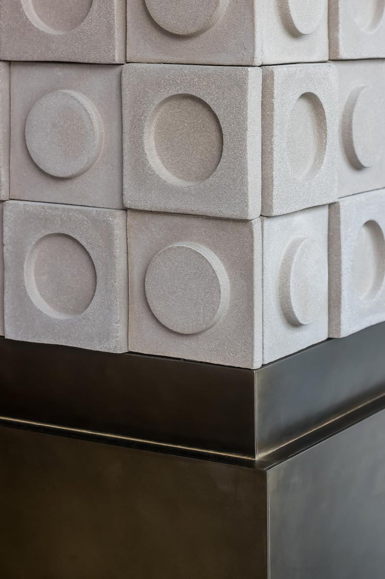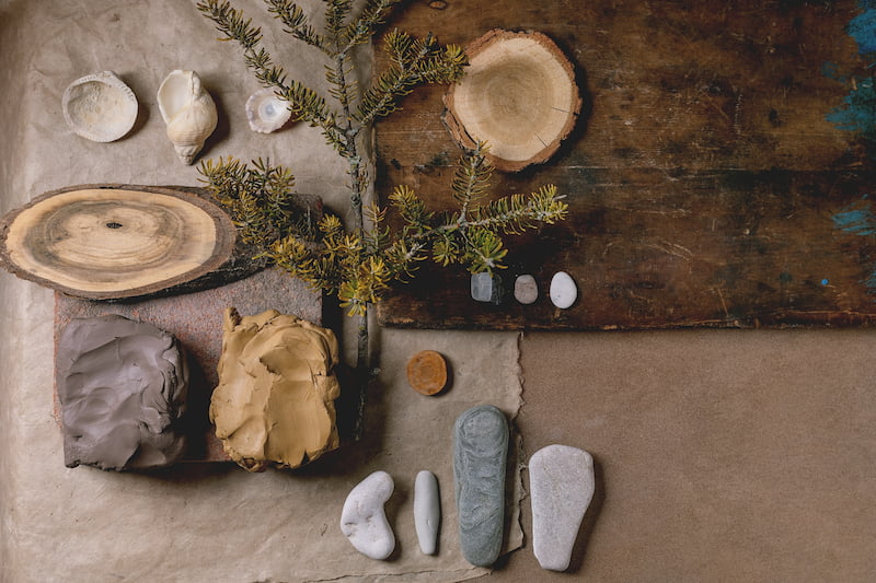 Uso de piedras recicladas y paletas inspiradas en la naturaleza, reflejando un compromiso con la conservación y la estética ecológica.