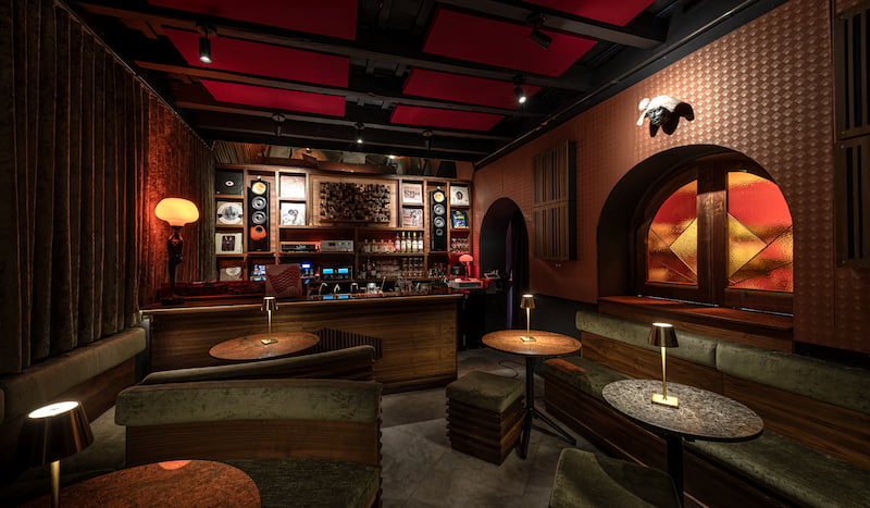 El proyecto, desarrollado junto a Máximo López Dinardi, combina precisión técnica y calidez artesanal. Cada mueble fue diseñado para optimizar la acústica, integrando madera de nogal, bordes curvos y acabados con aceites naturales que mejoran tanto la difusión sonora como la experiencia táctil. Una escalera escultórica y una barra con mueble difusor completan este entorno envolvente, donde cada detalle responde a una función estética y acústica.